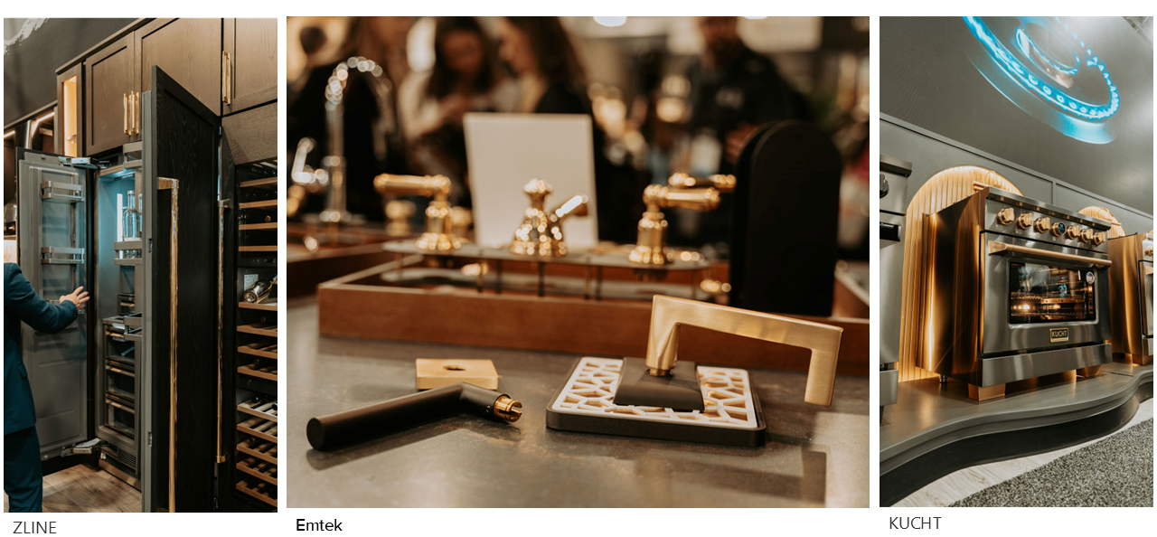 Goodbye, millennial gray. Deep, moody palettes were present in a glamorous way. As the New Home Trends Institute team predicted in our 24 trends for 2024, designers are using bolder designs and richer palettes to make simple designs look more visually appealing. The combination of black with warm metallics, such as gold and copper, was especially prevalent, creating a luxurious contrast that elevates both kitchens and bathrooms.