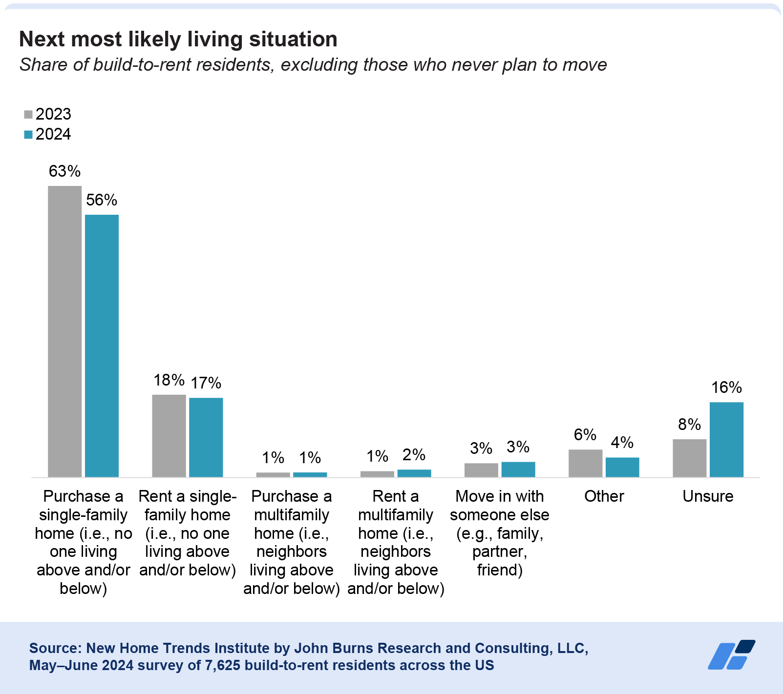Despite no change in how long residents plan to stay in their current home (most expect to stay for a median of 3 years), fewer plan to buy a home next. The percentage of residents who plan to purchase a single-family home has dropped 7 percentage points since 2023, down from 63% to 56%. Meanwhile, the percentage of those unsure about their next living situation doubled, rising from 8% to 16%.