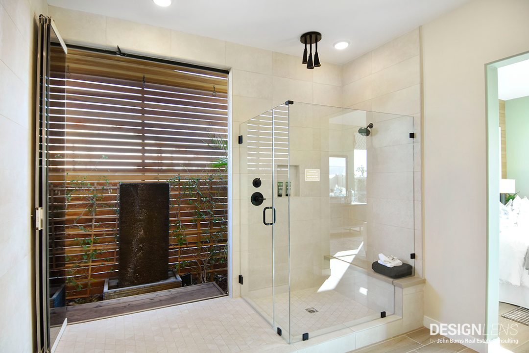 Spa baths are increasingly popular, with calming palettes and luxurious tubs and showers. Some even provide a connection to the outdoors like this master bath at Pardee Homes’ Elan at Altis. This bathroom provides a connection to the outdoors as well as a reasonably large shower and drying area.