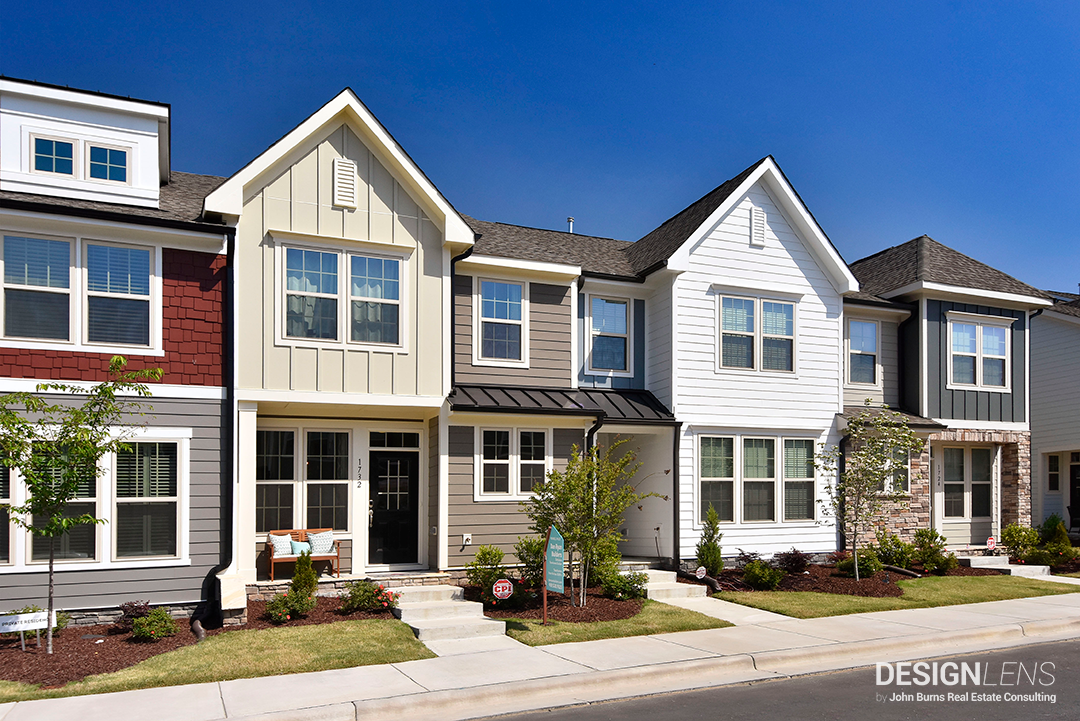 Varied elevation styles help define each unit in an attached collection, providing diverse street scenes and helping residents feel like their homes reflect their style. Dan Ryan Homes used color to define the units in their townhomes at Wendell Falls.