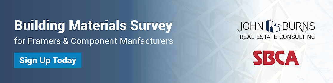 John Burns Real Estate Consulting is partnering with SBCA to launch a new joint survey for framers and component manufacturers. Help us, help you better understand what is happening in your market. By participating in the survey you will get access to a wealth of data and analysis that will give you valuable information to navigate the upcoming year.