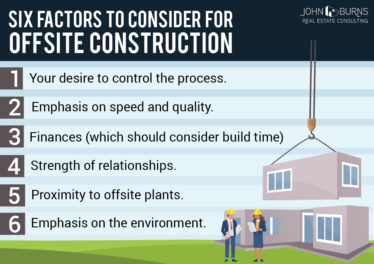 - Your financial analysis, which needs to consider build time. The direct cost of offsite will be higher than traditional stick framing. However, those costs are made up in speed to market, less waste, eliminated scaffolding, and more. Speed to market is one reason single family build-for-rent will likely be a likely driver of offsite, since speedy construction results in quicker leasing.