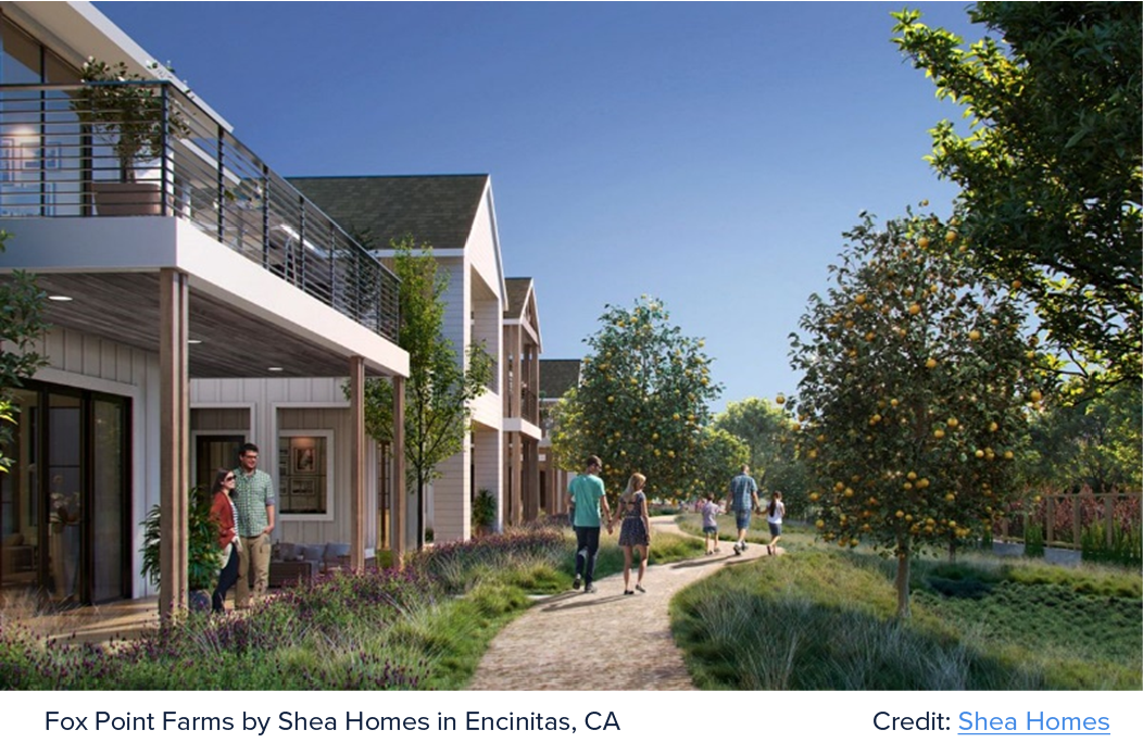 Perfect for outdoor lifestyle enthusiasts, Fox Point Farms in Encinitas takes agrihoods to the next level with edible landscaping. In the active playground of this SoCal city, where surfing, golfing, and leisurely strolls dominate, residents crave not just fun but also a nutritious diet to pair with their adventure. Imagine taking a stroll and snagging your own pick-me-up snack right off the citrus and nut-tree-lined trails or preparing home-cooked meals from the community gardens and 5.5-acre working farm.