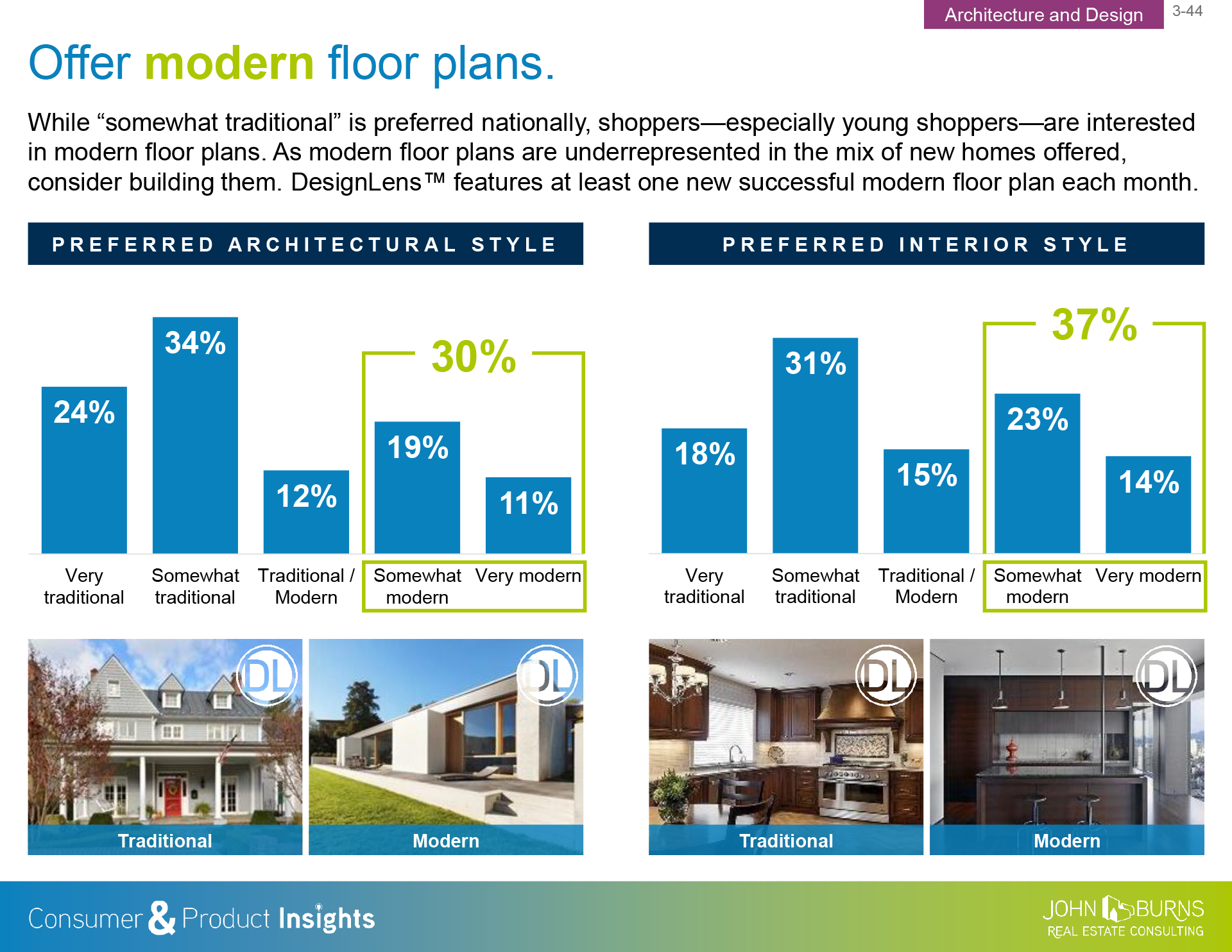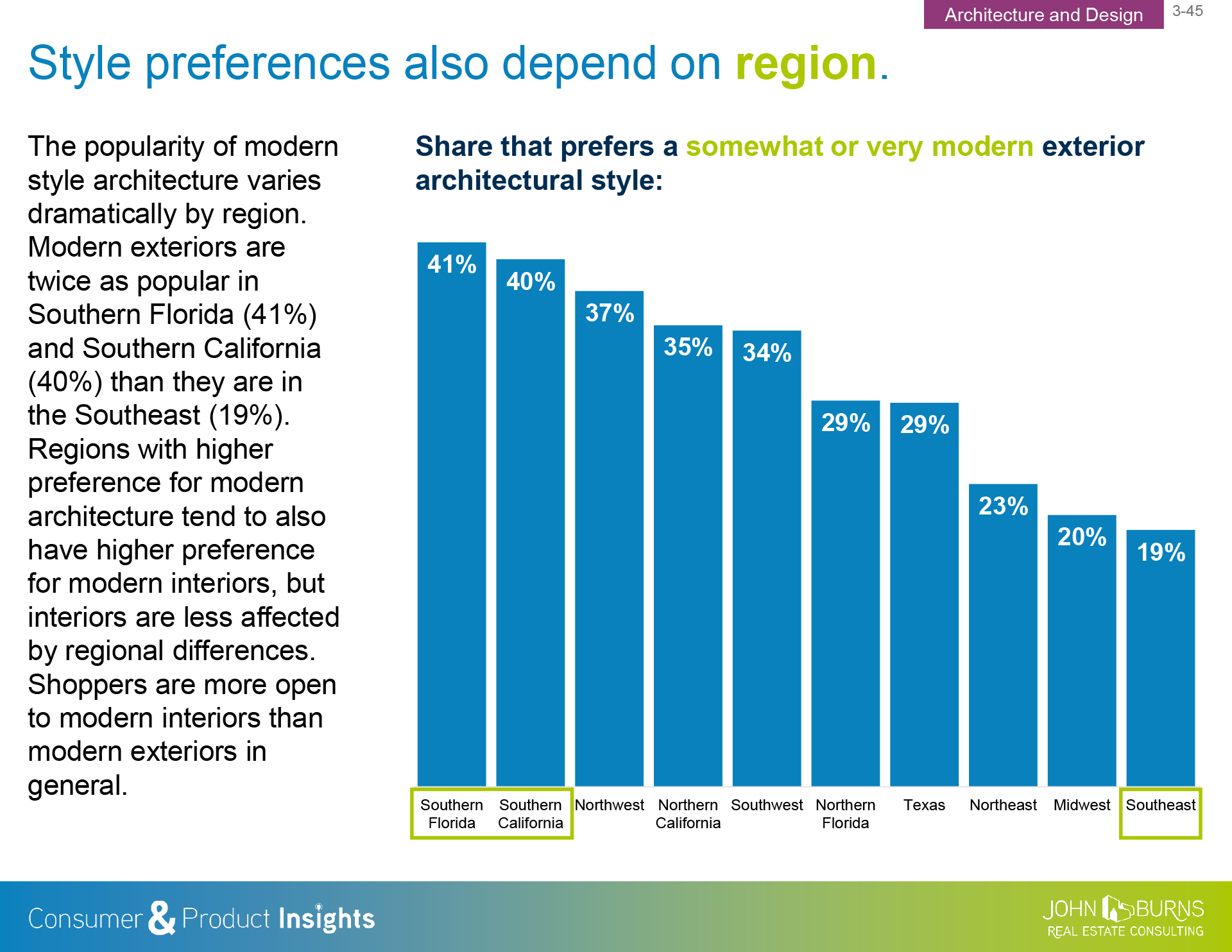 - New home shoppers. 30% of the new home shoppers in our recently completed 2018 Consumer Insights survey prefer a modern exterior style, and 36% prefer a modern interior style. New home shoppers in Southern California and Southern Florida are more than twice as likely to prefer modern exteriors as new home shoppers in the Midwest and Southeast are.