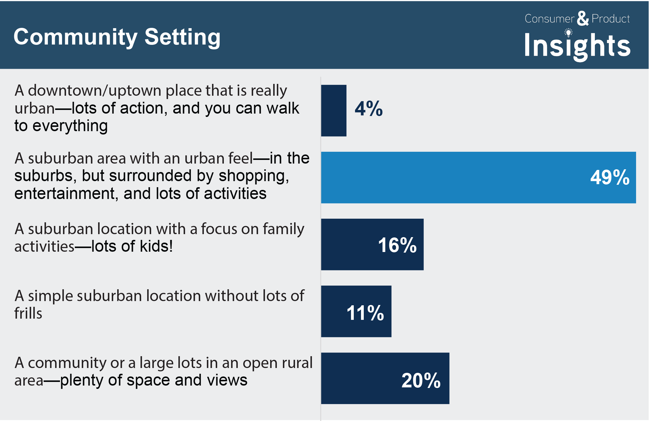 - When asked specifically about community setting, 49% of all new home shoppers want a surban location (defined in the question as “a suburban location with an urban feel—in the suburbs, but surrounded by shopping, entertainment, and lots of activities”). This is a far greater share than that of the other four options we offered: downtown (4%), family-oriented suburban (16%), suburban with few frills (11%), and a large lot rural area (20%).