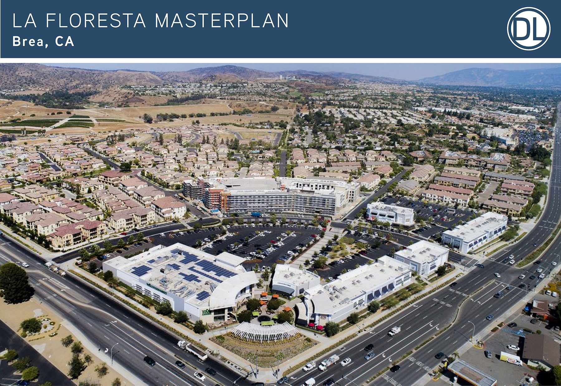 La Floresta masterplan, Brea, CA: La Floresta includes a mix of higher-density housing and an integrated retail center with restaurants, offices, and retail, including a large Whole Foods. Clusters, small-lot detached, and attached homes give this community a total net density of approximately 9 homes per acre. A unique feature of this surban community is its age-qualified section.