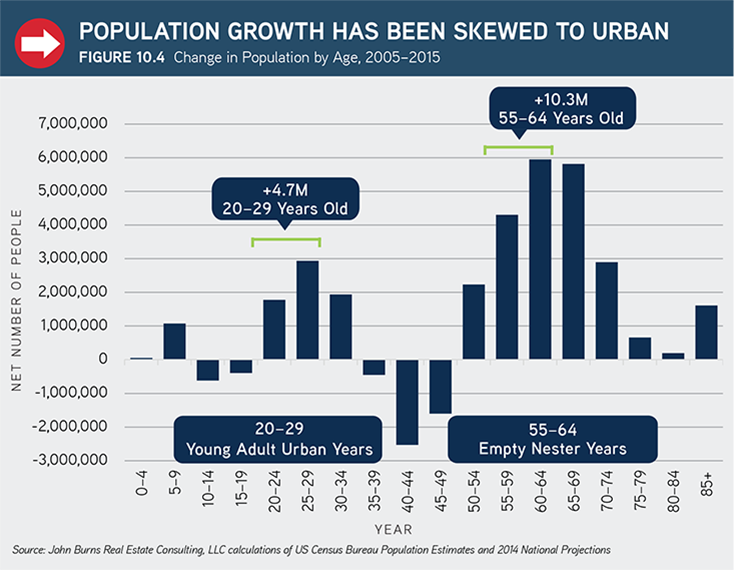 - Societal shift. Between 2005 and 2015, the age groups that tend to skew urban (young adults between 20 and 29 years old and empty nesters between 55 and 64 years old) grew by 15 million people. This urban wave started an organic overhaul of the traditional suburban model.