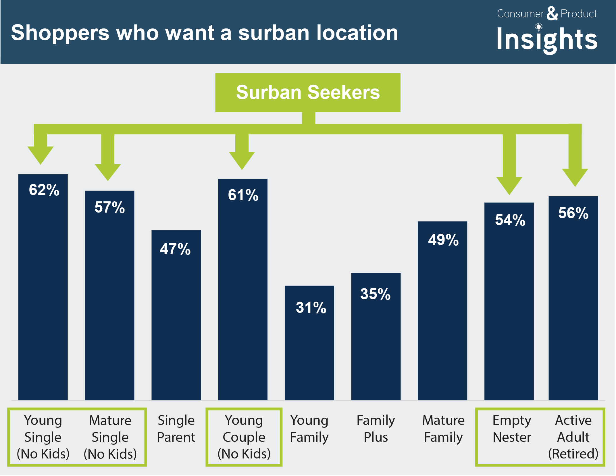 Surban areas are especially popular with non-family shoppers, but even 30%+ of family new home shoppers are still interested in surban areas, a share that rises as the children get older.